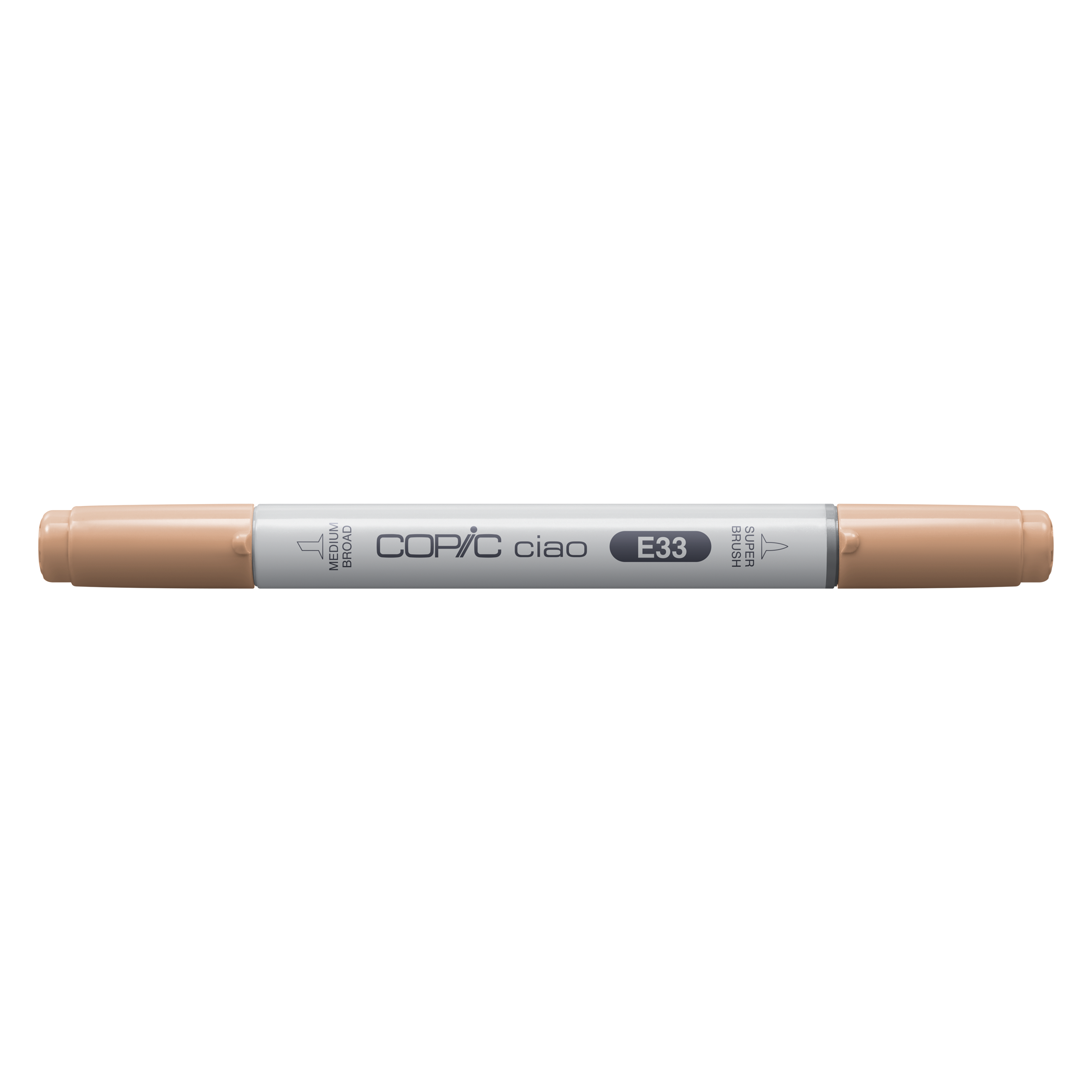 Copic Ciao Marker E33, der preisgünstige, doppelseitige Allround-Marker in 180 Farben. Der Copic Ciao bietet Newcomern viele Produktvorteile, die bereits den Copic classic und den Copic Sketch aus dem Profilager ausgezeichnet haben. Ausgestattet mit einer universell einsetzbaren, mittelbreiten Spitze, verfügt er außerdem über eine flexible Pinselspitze. Mit dieser können weiche Striche mit interessanten Modulationen erzielt werden. Der Ciao Marker ist daher für Modedesign und Kalligrafie, zum Skizzieren, Scribblen und Layouten perfekt einsetzbar. Insbesondere Hobbykünstler & Mangaka bevorzugen den Copic Ciao, u.a. zum Kolorieren von Scrapbookings, Stempelkunst und handgemachten Karten. Die eingefärbten Kappen ermöglichen eine schnelle und exakte Identifizierung der Farbtöne. Die 180 leuchtenden Farben auf Alkoholbasis sind toxikologisch unbedenklich und nahezu geruchlos. Die Tinte trocknet schnell, verwischt nicht und kann auf der Fläche gemischt und übereinandergelegt werden. Alle erhältlichen 180 Farben können mit Copic Ink farbidentisch wieder aufgefüllt werden. Mit einer einzigen Nachfüll-Flasche kann der Marker 9 x wieder aufgefüllt werden. Das garantiert ein optimales Kosten-Nutzen-Verhältnis, ist umweltfreundlich und wirtschaftlich.