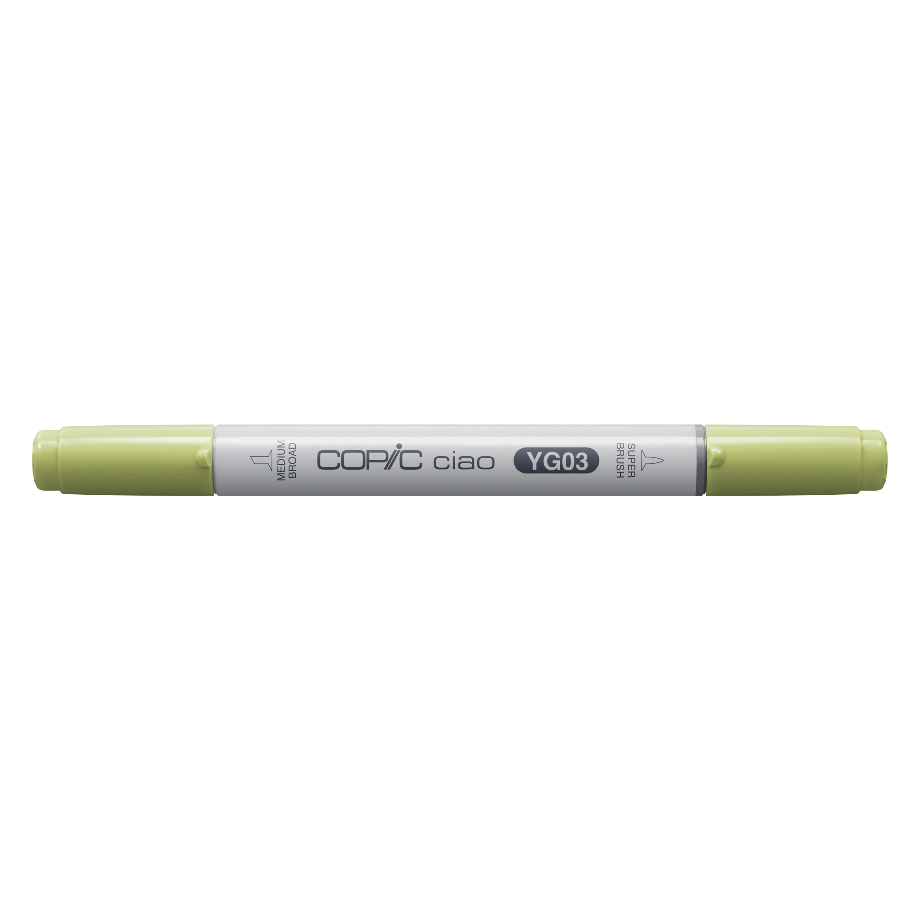 Copic Ciao Marker YG03, der preisgünstige, doppelseitige Allround-Marker in 180 Farben. Der Copic Ciao bietet Newcomern viele Produktvorteile, die bereits den Copic classic und den Copic Sketch aus dem Profilager ausgezeichnet haben. Ausgestattet mit einer universell einsetzbaren, mittelbreiten Spitze, verfügt er außerdem über eine flexible Pinselspitze. Mit dieser können weiche Striche mit interessanten Modulationen erzielt werden. Der Ciao Marker ist daher für Modedesign und Kalligrafie, zum Skizzieren, Scribblen und Layouten perfekt einsetzbar. Insbesondere Hobbykünstler & Mangaka bevorzugen den Copic Ciao, u.a. zum Kolorieren von Scrapbookings, Stempelkunst und handgemachten Karten. Die eingefärbten Kappen ermöglichen eine schnelle und exakte Identifizierung der Farbtöne. Die 180 leuchtenden Farben auf Alkoholbasis sind toxikologisch unbedenklich und nahezu geruchlos. Die Tinte trocknet schnell, verwischt nicht und kann auf der Fläche gemischt und übereinandergelegt werden. Alle erhältlichen 180 Farben können mit Copic Ink farbidentisch wieder aufgefüllt werden. Mit einer einzigen Nachfüll-Flasche kann der Marker 9 x wieder aufgefüllt werden. Das garantiert ein optimales Kosten-Nutzen-Verhältnis, ist umweltfreundlich und wirtschaftlich.