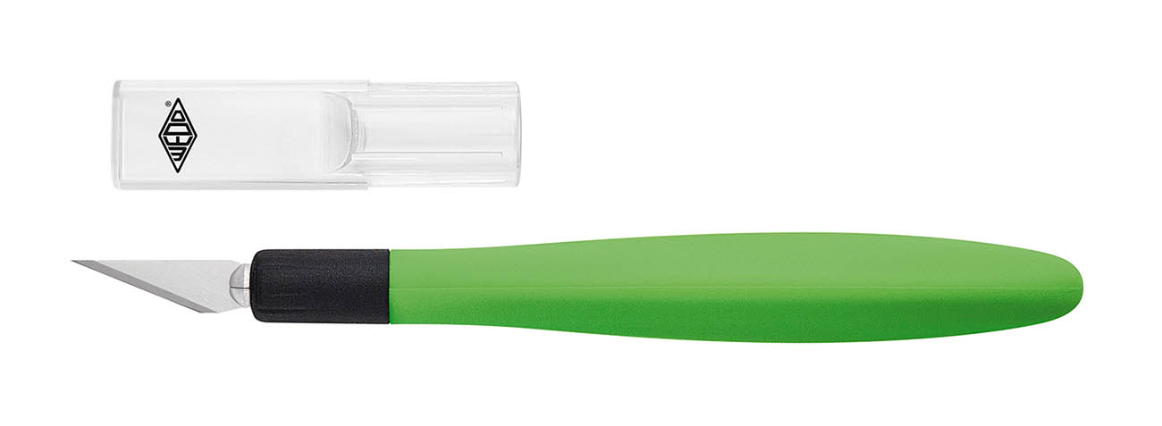 WEDO® Skalpell Comfortline mit Softgriff. Das Skalpell Comfortline ist nicht nur ein präzises Werkzeug, das komfortabel in der Hand liegt und sich ausgezeichnet führen lässt, es überzeugt auch durch seine Form und Farbgebung. Der dreieckig geformte Messerschaft hat eine samtige Haptik und bringt in trendigem Apfelgrün Farbe auf den Arbeitstisch. Die spitze, extrem scharfe Klinge ist ideal für feine Schneidearbeiten. Zur sicheren Aufbewahrung immer die Schutzkappe aufstecken. Maße: 16,5 x 1,8 x 1,8 cm, Länge ohne Schutzkappe 15 cm, Farbe: apfelgrün/schwarz. Lieferung auf SB-Karte mit 5 Ersatzklingen.