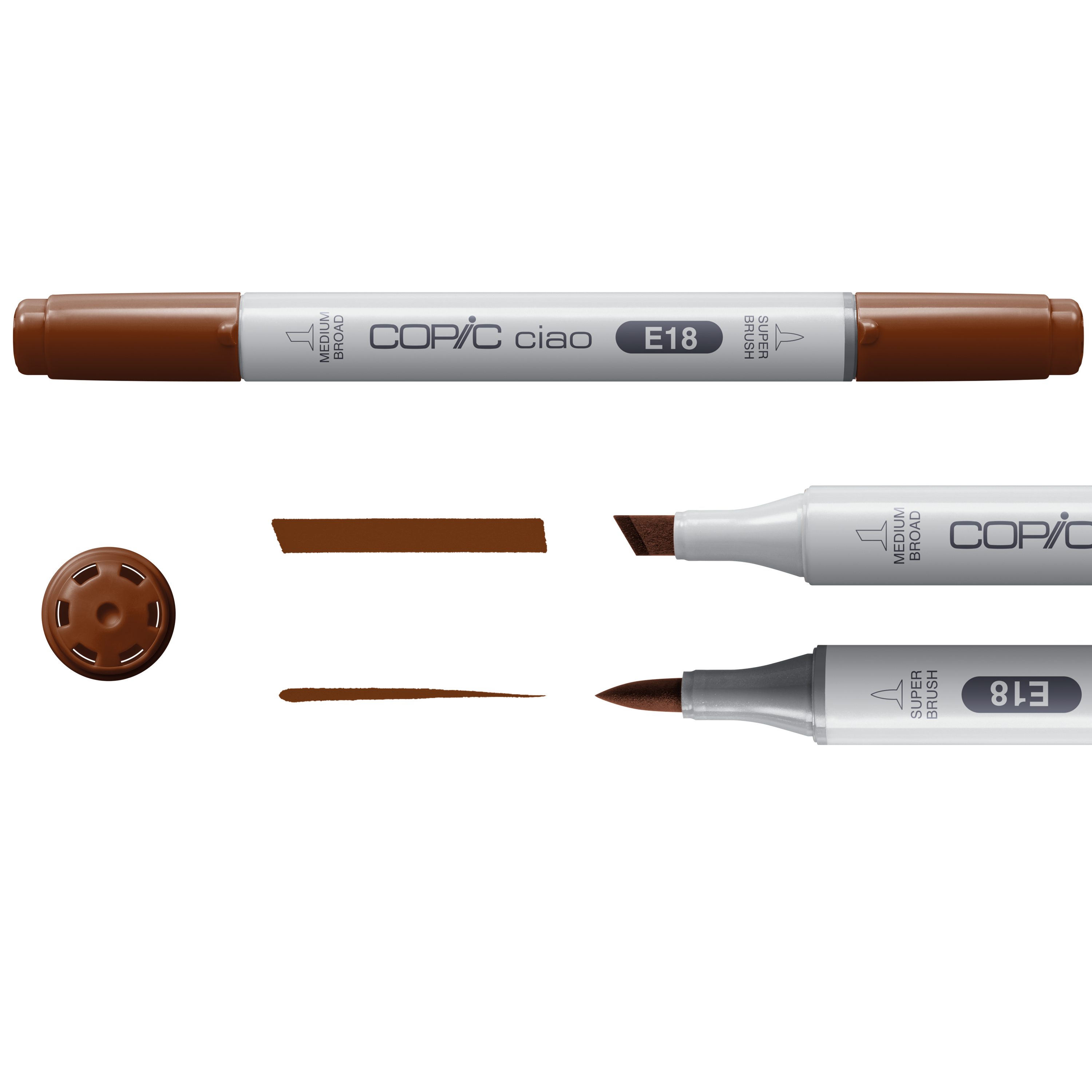 Set mit speziellen Farbtönen, die sich gegenseitig ergänzen und deine Farbsammlung erweitern. Copic Ciao ist der perfekte Grafikmarker für Einsteiger. Die Farben können verblendet oder übereinander gelegt werden, um deiner Zeichnung Tiefe und Struktur zu verleihen. Die beiden Spitzen - eine Pinselspitze und eine mittelbreite Keilspitze - ermöglichen weiche und präzise Striche. Hergestellt mit Tinte auf Alkohol- und Farbpigmentbasis in professioneller Qualität. Trocknet schnell und verwischt nicht. Nachfüllbar mit Copic Ink, die in 180 Farbtönen erhältlich ist. Das Set enthält einen Copic Multiliner (black, 0.3 mm), mit dem eine gleichmäßige Linienführung und Präzision möglich ist. So ist er perfekt für Konturen und letzte Feinarbeiten geeignet. Wenn die wasserfeste Tinte auf Pigmentbasis vollständig getrocknet ist, blutet sie bei Kontakt mit Wasser nicht aus. Enthaltene Farben: E18 (Copper), E25 (Calibe Coccoa), E59 (Walnut), E79 (Cashew), 100 (Black).