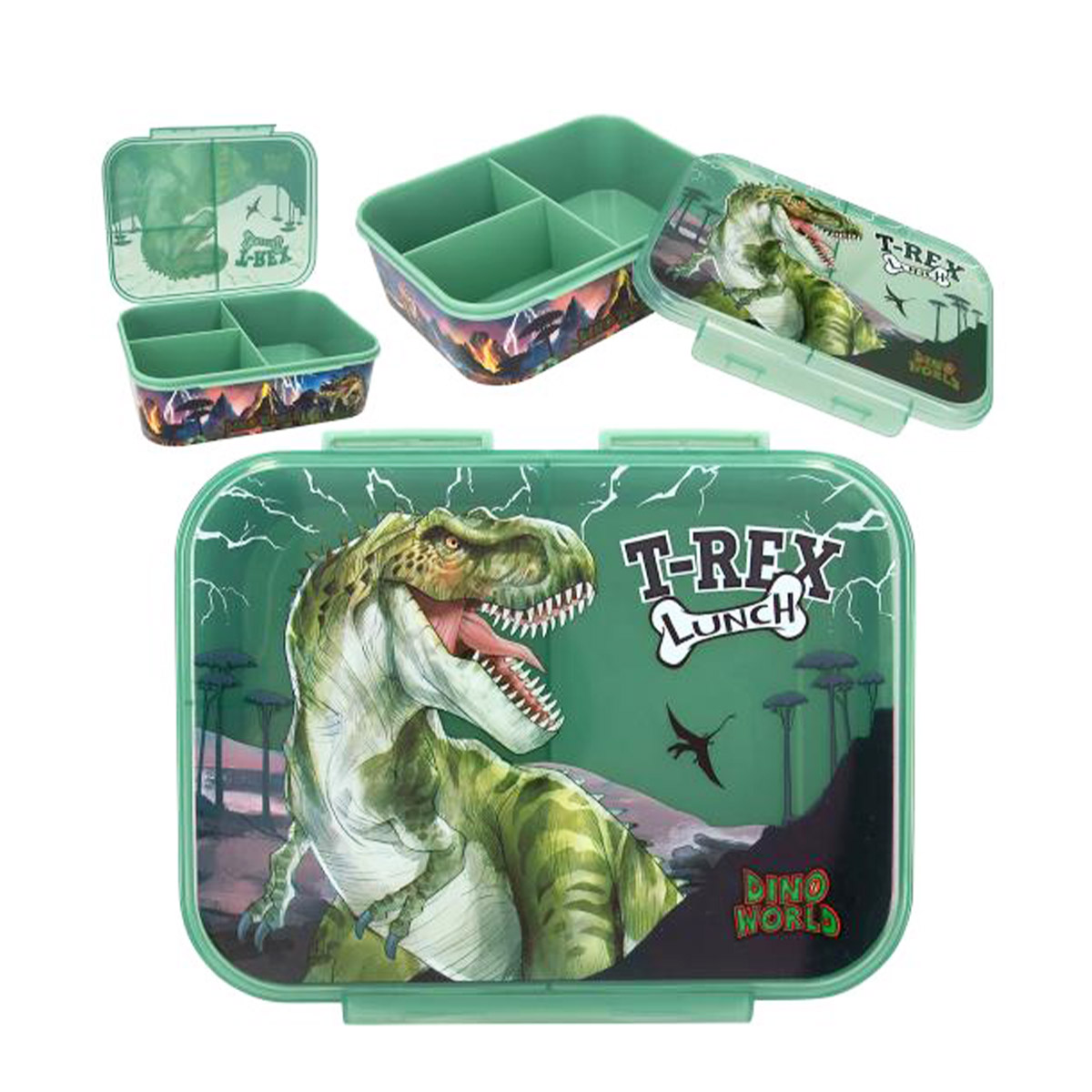 Eine Brotdose, drei separate Fächer, ein transparenter Deckel und jede Menge Dino-Action.