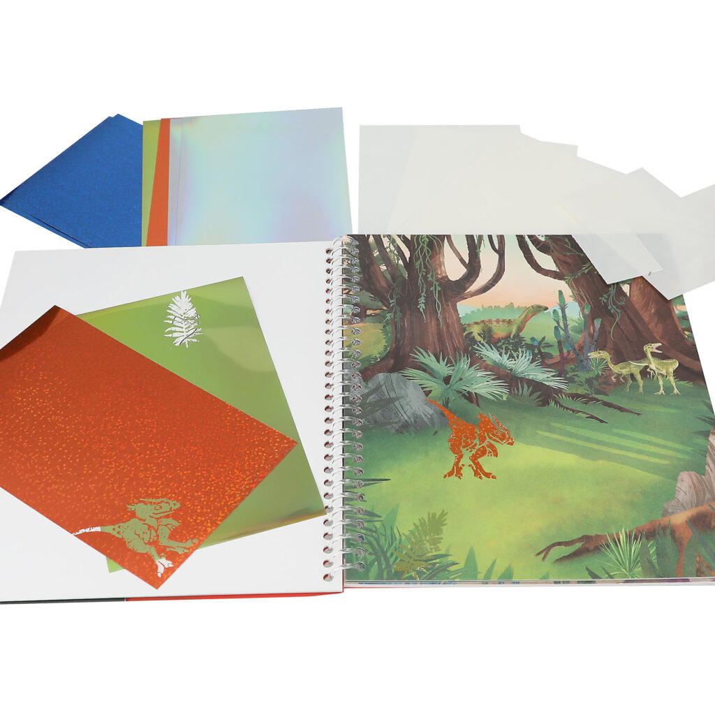 Dino World Colouring Book Stick & Shine, Malbuch mit Dinosaurier-Vorlagen, mit Tatoos und Glitzerfolie, Depesche