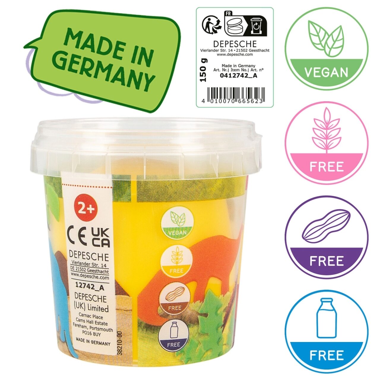 Die Knete wird in Deutschland hergestellt und ist, durch die Basis aus Kartoffelstärke, glutenfrei, laktosefrei, nussfrei und vegan.