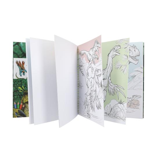Das Malbuch bietet 20 Ausmal-Motive von coolen Dinos und einen Bogen mit bunten Stickern.