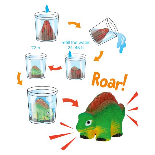 Legt man den Lava-Berg in Wasser, wäscht sich einer von 6 verschiedenen Sauriern innerhalb von 72 Stunden heraus und wächst zu seiner endgültigen Größe.