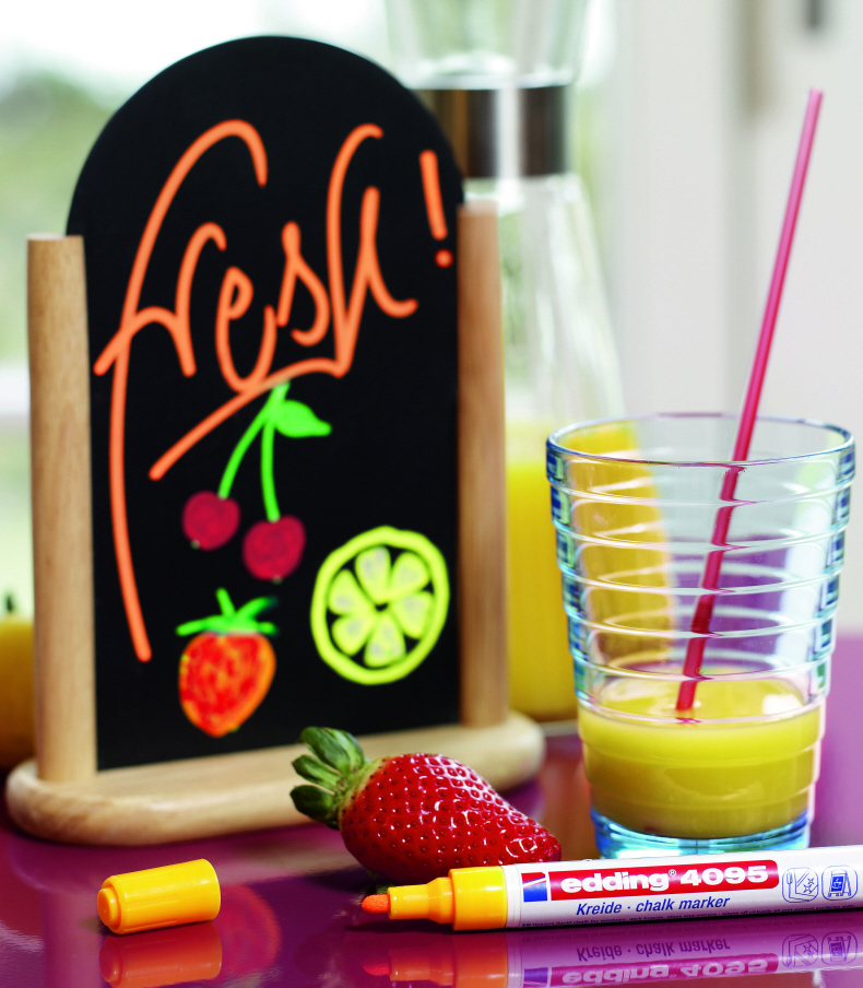 Kreidemarker für die nicht-permanente Gestaltung, Dekoration und Beschriftung von geschlossenen Oberflächen, z. B. Fenster, dunkle Tafeln, Glas, PLEXIGLAS® und Spiegel. Die Rundspitze verfügt über eine Strichbreite von 2-3 mm. Die deckende, geruchsneutrale Flüssigkreide auf Wasserbasis kann von fast allen geschlossenen Oberflächen mit einem feuchten Tuch abgewischt werden.