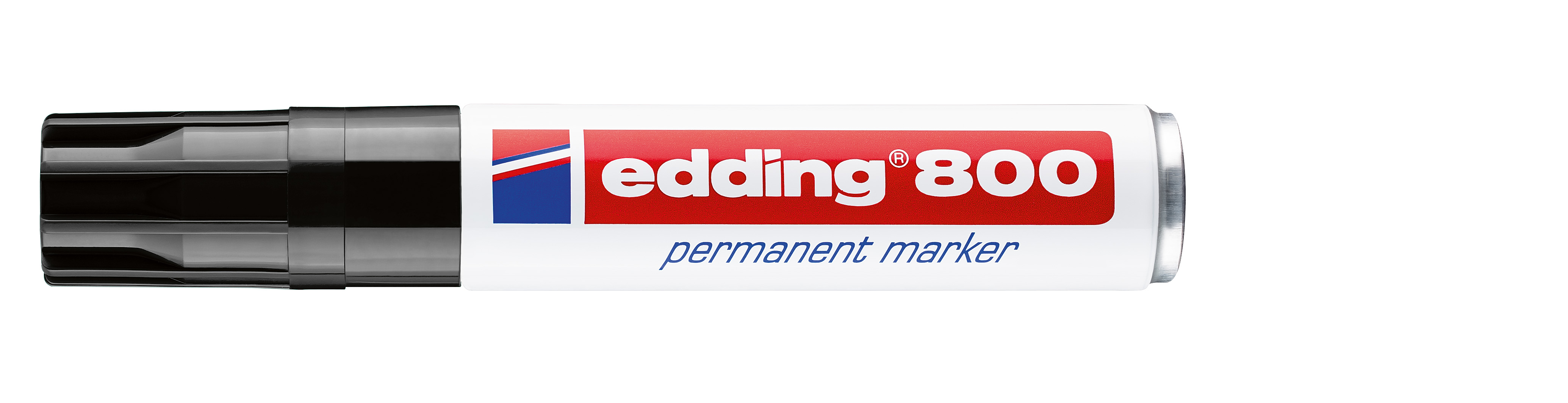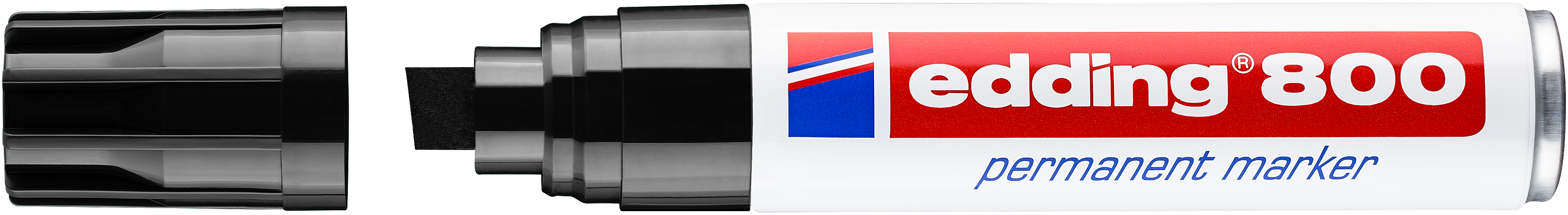 Permanentmarker zum breiten Markieren und Beschriften fast aller Materialien wie z. B. Papier, Karton, Metall, Glas, Kunststoff und Holz. Die Keilspitze hat eine Strichbreite von 4-12 mm. Wasserfest und abriebbeständig auf fast allen Oberflächen. Das Produkt ist nachfüllbar mit edding T 25, T 100 und T 1000 Nachfülltinte. Passende Ersatzspitzen (edding 800 Ersatzspitzen) sind erhältlich. Die Tinte ist geruchsarm und ohne Zusatz von Toluol/Xylol. Hochwertiger Aluminiumschaft.