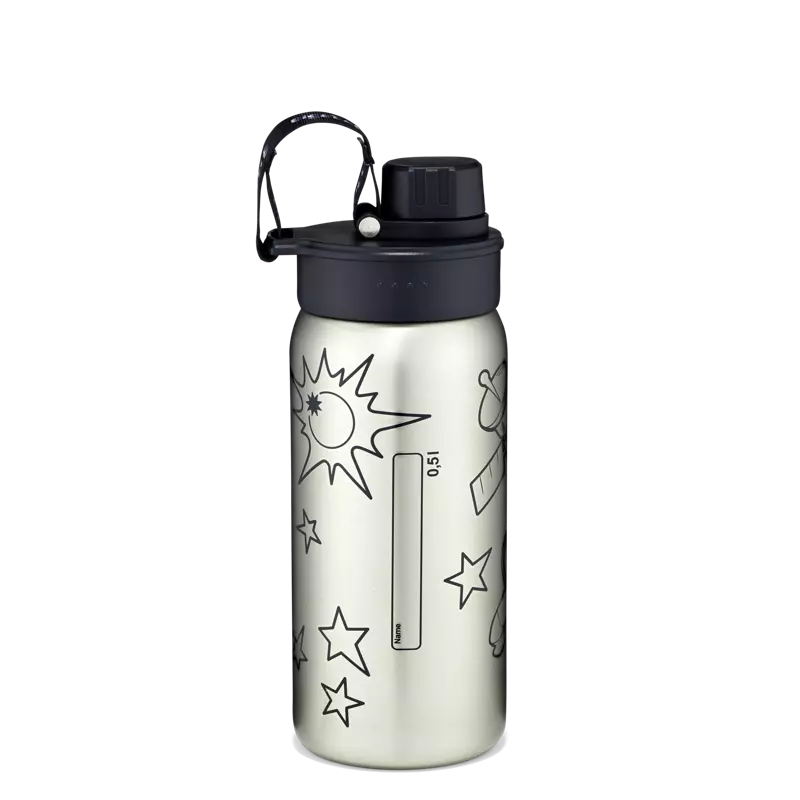 Edelstahl-Trinkflaschen: - Unsere praktischen Trinkflaschen fassen einen halben Liter Flüssigkeit und passen damit perfekt in das Frontfach unserer Schultaschen. Sie werden regelmäßig auf Schadstoffe getestet und erfüllen die gesetzlichen Anforderungen. - Sie können auch in der Spülmaschine bei bis zu 65°C gereinigt werden, wir empfehlen aber trotzdem Handwäsche. - - Details: - - Größe: 7.2 x 20.5 x 7.2 cm (B/H/T) - Gewicht: 160 g - Volumen: 0.5 Liter