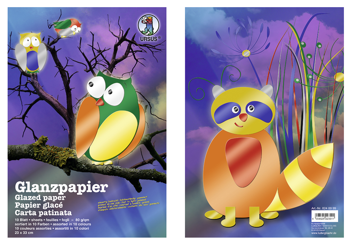 10 Blatt einseitig bedrucktes und nassklebendes Glanzpapier gummiert 80 g/qm. Die Blätter haben eine Größe von 23 x 33 cm und sind in 10 Farben sortiert.