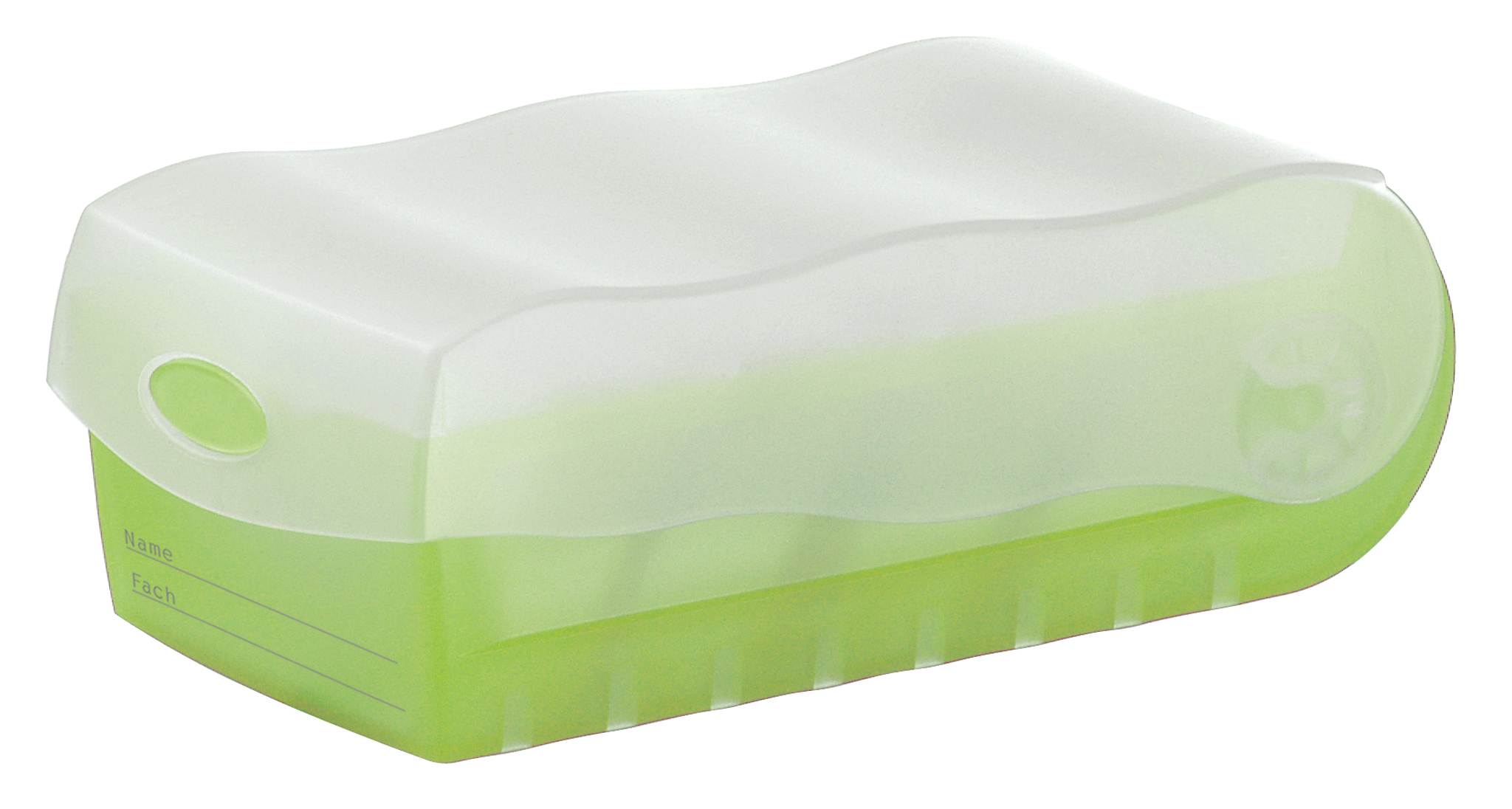 Dank ihrer stabilen Konstruktion eignet sich die Box ebenso hervorragend zur Aufbewahrung kleiner Utensilien. Beim Öffnen gleitet der Deckel platzsparend unter das Unterteil, während die Stützen im geschlossenen Zustand sicher arretiert sind.
