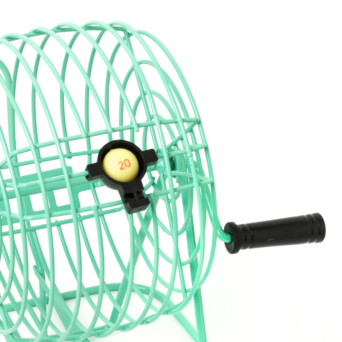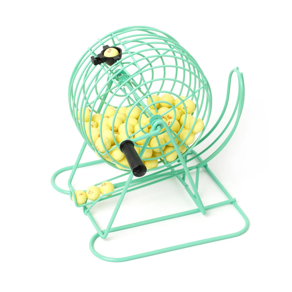 Inhalt: 1 drehbare Ziehungstrommel aus Metall mit Kugelauffangvorrichtung, 90 nummerierte Kugeln, 1 Tafel, 60 wiederverwendbare Spielkarten, 300 Nummernmarker, 2 Stoffbeutel