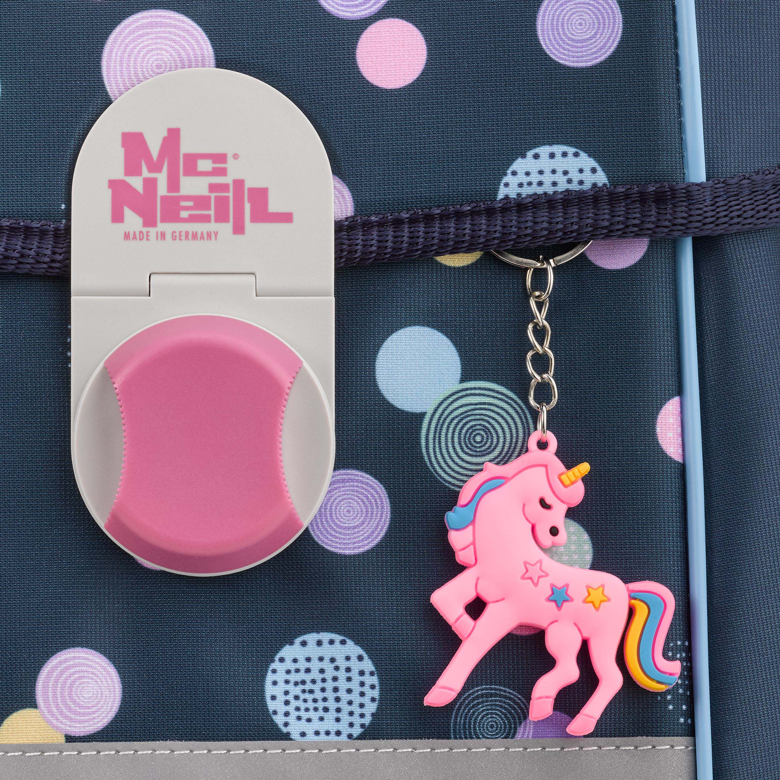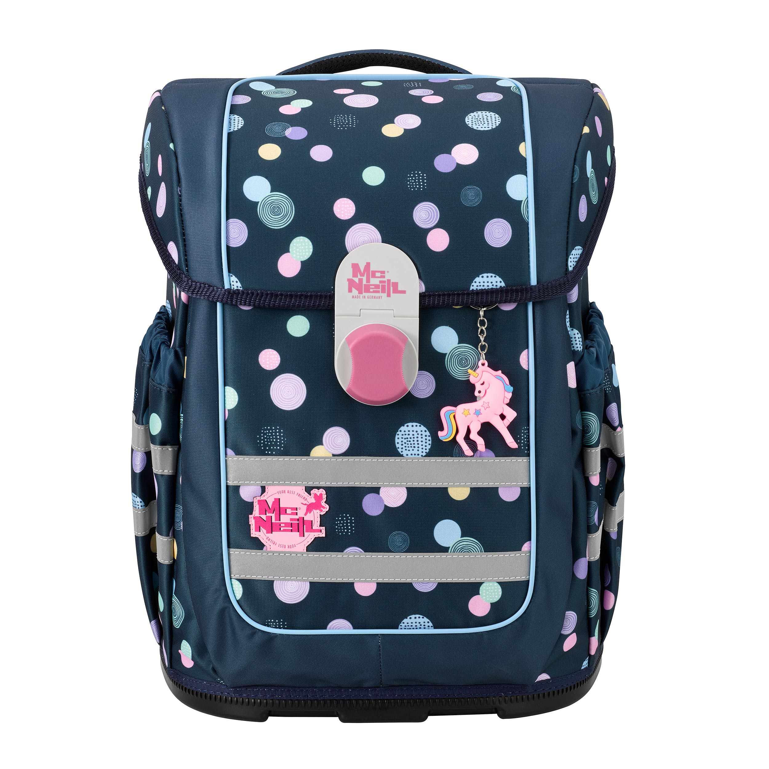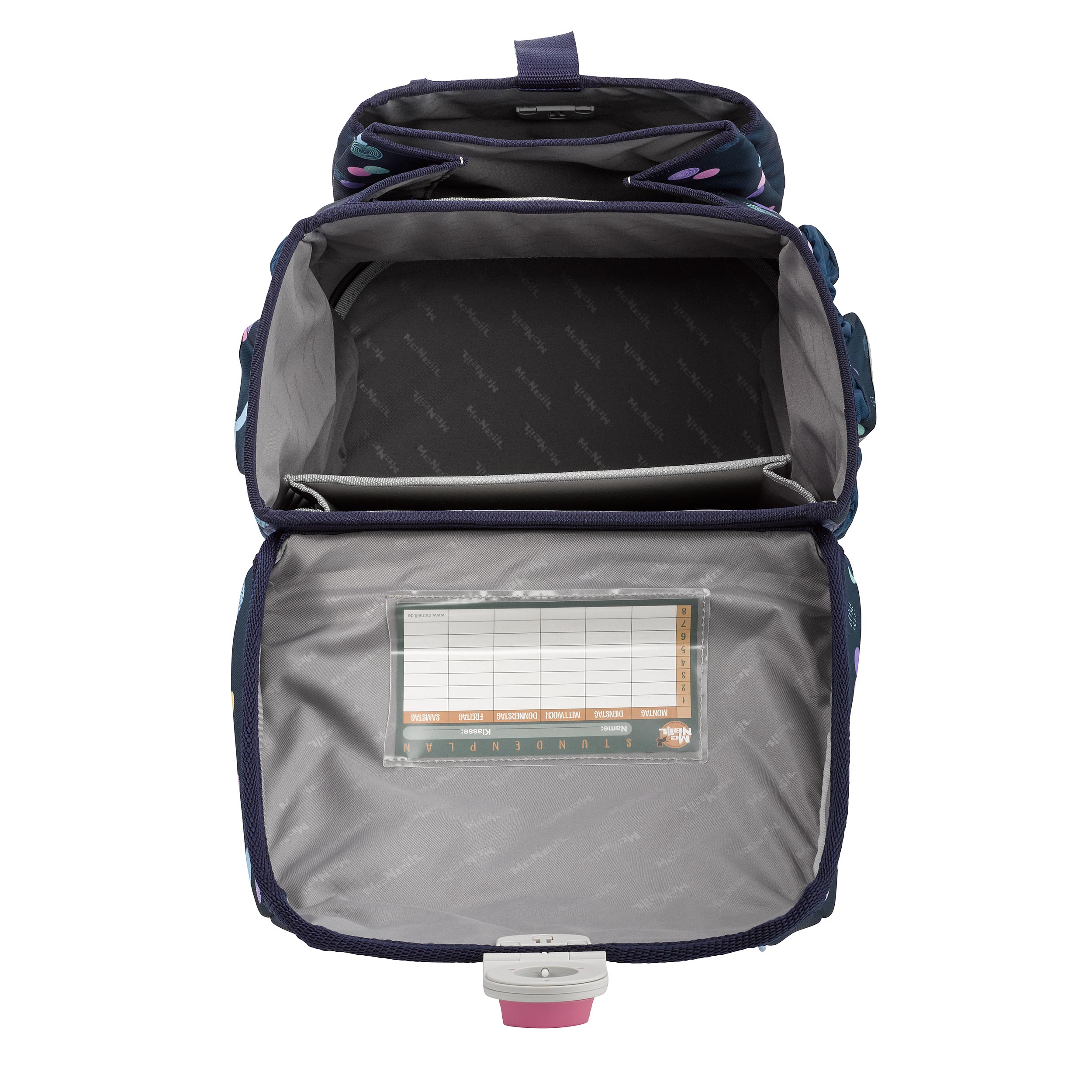McNeill Schulranzen-Set Ergo Complete - Das Set besteht aus: - - McNeill Schulranzen - Das ergonomische Rückenpolster, die gepolsterten Schulterriemen mit retroreflektierenden Streifen, der verstellbare Brustgurt und ein abnehmbarer Beckengurt machen den ERGO COMPLETE zu einem optimalen Ranzen. Der ERGO COMPLETE ist ausgestattet mit dem höhenverstellbaren SmartFlex Tragesystem für idealen Sitz. Der Schulranzen lässt sich mit dem Einhandmagnetschloss kinderleicht öffnen. Das Hauptfach verfügt über eine praktische Innenaufteilung mit einem Bücherfach. Am Überschlag besitzt der Schulranzen einen gepolsterten Tragegriff. Die zwei Vortaschen mit Organizer bieten zusätzlichen Stauraum. In den zwei dehnbaren Seitentaschen lassen sich Regenschirm und Trinkflasche sicher verstauen. Mit dem Schlüsselband lässt sich der Fahrradschlüssel sicher aufbewahren. Der standfeste und wasserabweisende Boden bietet Schutz vor Nässe. Eine Vielzahl reflektierender Elemente bieten Ihrem Schulkind zusätzliche Sicherheit im Straßenverkehr . - Sportbeutel - separat zu tragen oder ganz einfach am Schulranzen zu fixieren, bietet Platz für Sport- und Schwimmutensilien - Federmäppchen - komplett bestückt mit hochwertigen Schulmaterialien (23tlg.), inklusive Jumbo-Malstifte, Stundenplan, Lineal, Radiergummi, Anspitzer, kleine Tasche mit Klettverschluss und Co. - Schlamperrolle - für Schere, Kleber und die kleinen Dinge im Schulalltag - McAddy - abnehmbare McAddies sorgen bei Bedarf für ein schlichteres Design, zur individuellen Gestaltung ist der Schulranzen auch kompatibel mit den McTaggies, (Bitte beachten Sie, dass die McAddies/McTaggies von der Darstellung abweichen können) - Nachhaltigkeit und verantwortungsvoller Umgang mit Ressourcen. Der McNeill Schulranzen ist ein klimaneutrales Produkt.