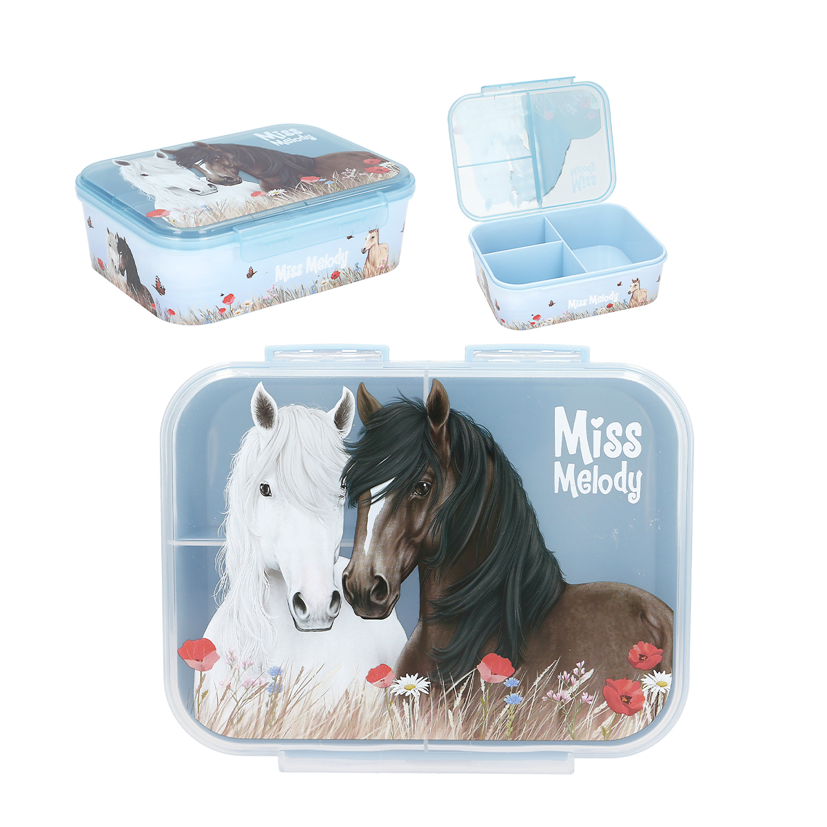Die Brotdose von Miss Melody ist außen ein echter Hingucker und unter dem transparenten Deckel überzeugend praktisch in drei unterschiedlich große Fächer eingeteilt.