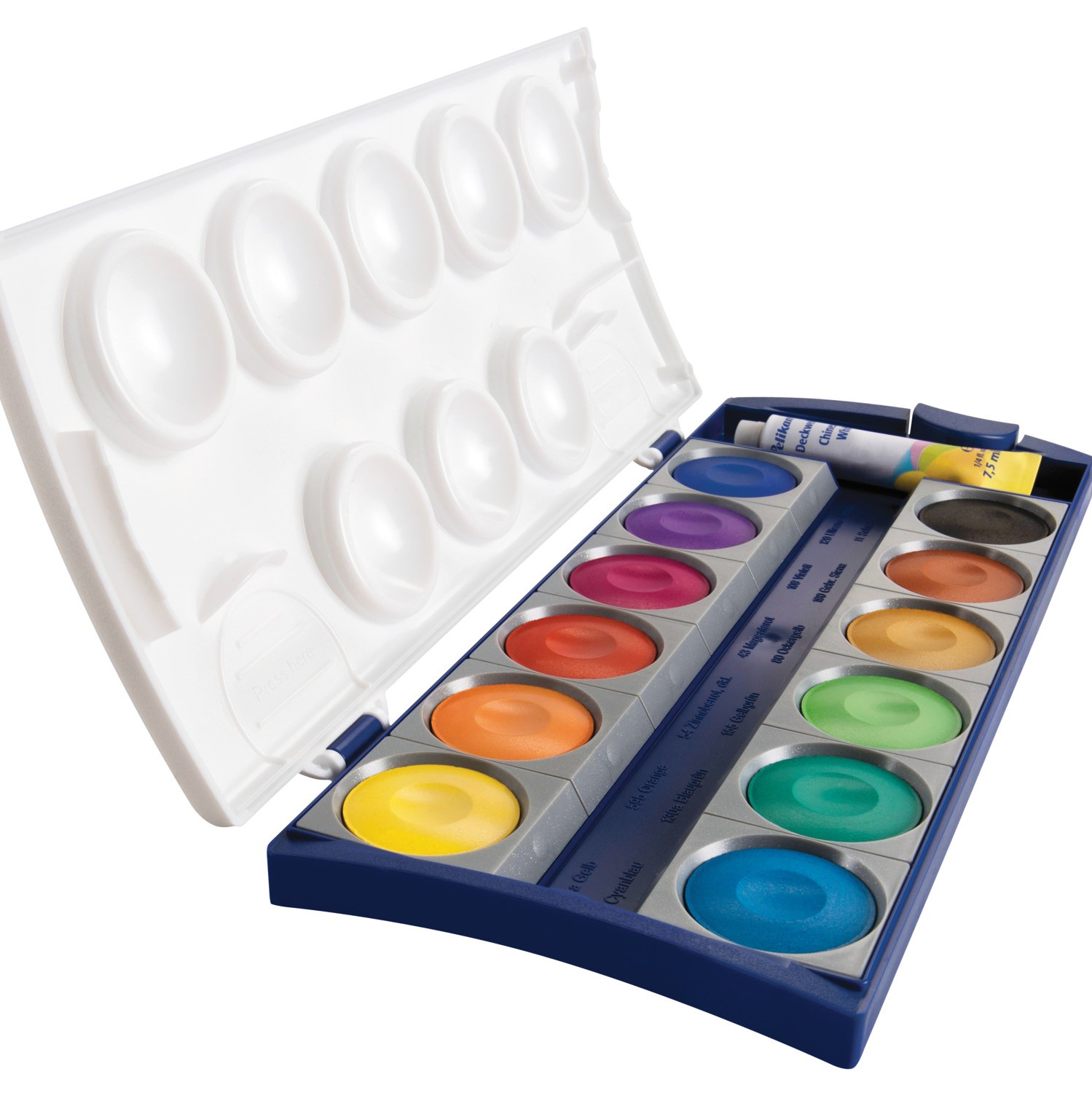 Die Nr. 1 in der Schule. Von Lehrern empfohlen. Unterstützt die lehrplangerechte Farbenlehre. Starke Deckkraft. Echte Pigmente. Auswechselbare Farbschälchen. Deckel mit vielen Mischtöpfen. Zum Reinigen leicht abnehmbar. Beschriftbares Namensfeld im Deckel. Platz für Pinsel. Inkl. 1 Tube Deckweiß mit 7,5 g. Blaue Pelikan-Wasserbox oder Elefantenwasserbox ansteckbar. Made in Germany.