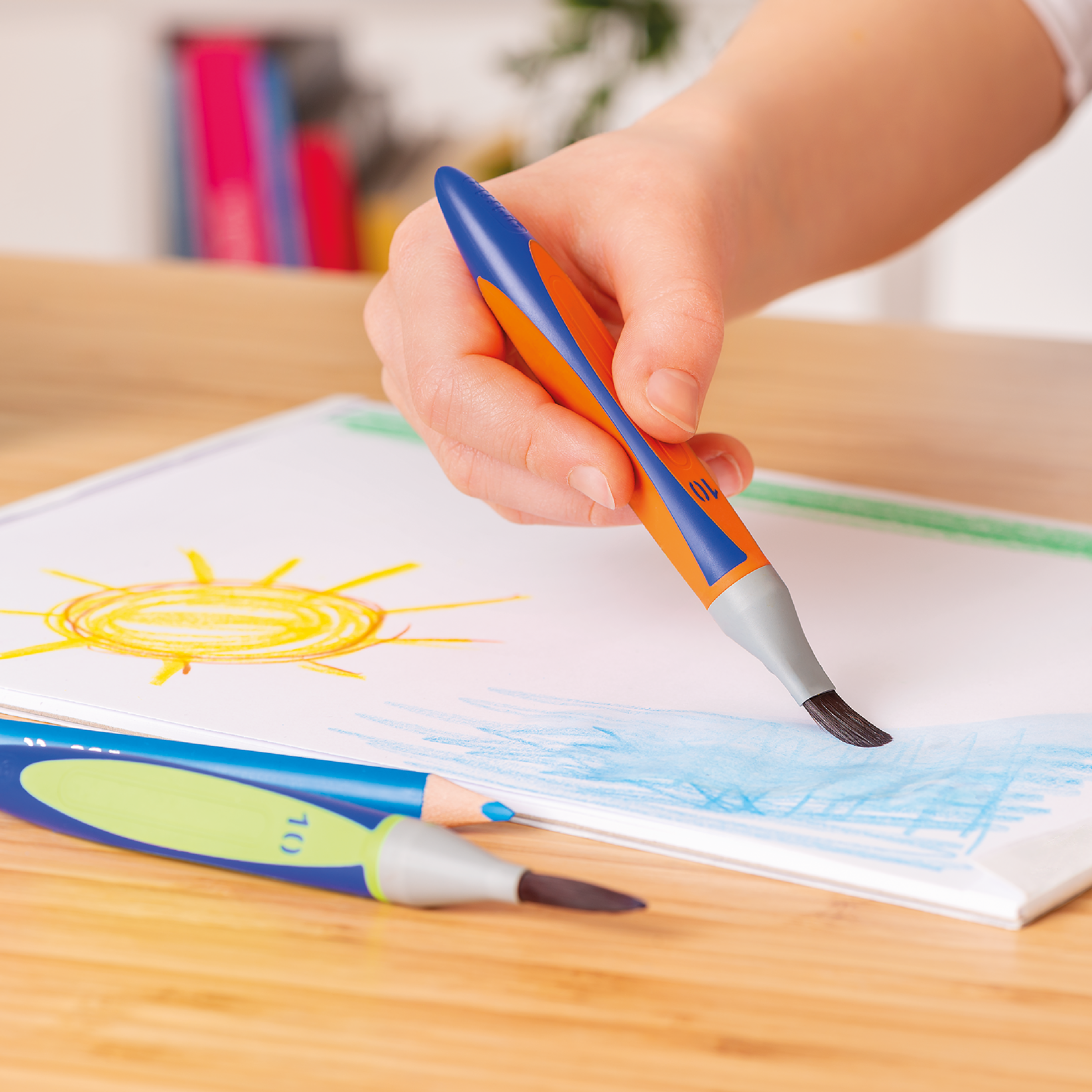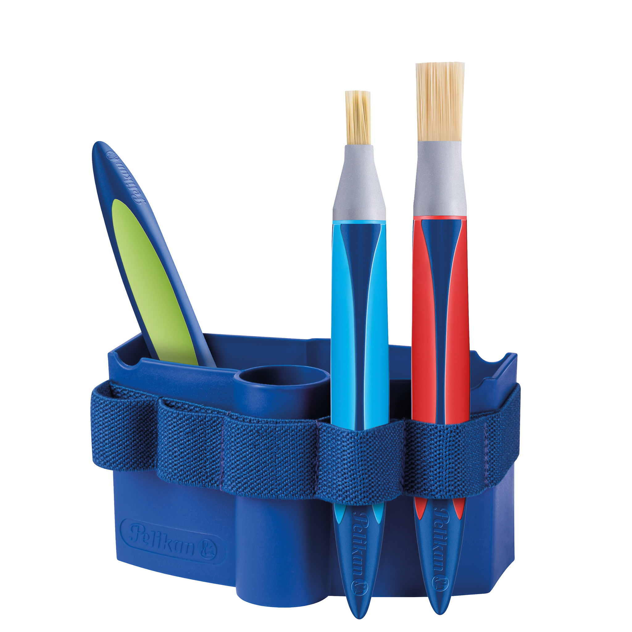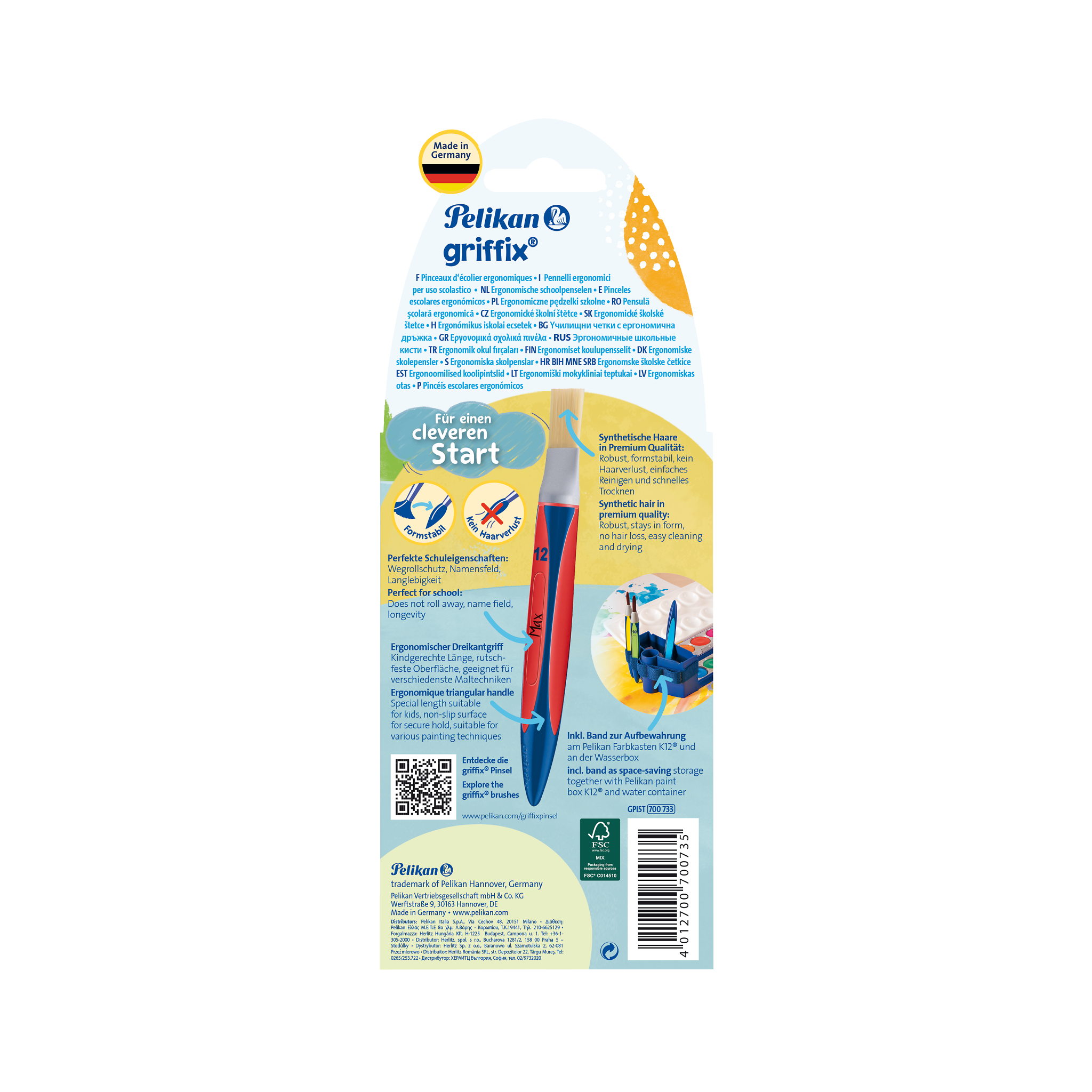 Die Pelikan griffix Pinsel liegen dank des speziellen ergonomischem und rutschfesten Dreikantgriffs in kindgerechter Länge besonders gut in der Hand. Darüber hinaus verhindert die Form das Wegrollen der Pinsel. Alle Pelikan griffix Pinsel mit synthetischen Haaren in Premiumqualität sind formstabil und verlieren keine Haare. Darüber hinaus sind die griffix Pinsel sehr leicht zu reinigen und trocknen schnell - so sind sie im Handumdrehen wieder bereit neue, bunte Welten zu erschaffen. Das griffix Pinselset besteht aus 2 Pinseln mit flachem Pinselkopf, wie klassische Borstenpinsel (Größe 12 und 6), sowie 2 Pinseln mit rundem Pinselkopf, wie altbekannte Haarpinsel (Größe 10 und 6) und einem Synthetikpinsel (Größe 10). Der flache griffix Pinsel in Größe 12 ist ideal für große Flächen. Mit dem Pinsel in Größe 6 können kinderleicht kleinere Flächen, Kanten und grobe Linien gemalt werden. Der griffix haarähnliche Pinsel mit runder Spitze in Größe 10 ist perfekt für geschwungene Linien und größere Details, wohingegen der 6er Pinsel ideal für feine Details ist. Abschließend ist der Pelikan griffix Synthetikpinsel in Größe 10 - eine sogenannte Katzenzunge - das Allroundtalent und hervorragend für Striche, Kurven und geschwungene Linien. Alle griffix Pinsel werden von dem im Set enthaltenem Pinselband zusammengehalten und können so direkt an dem Farbkasten befestigt werden. Pelikan Qualität - Made in Germany
