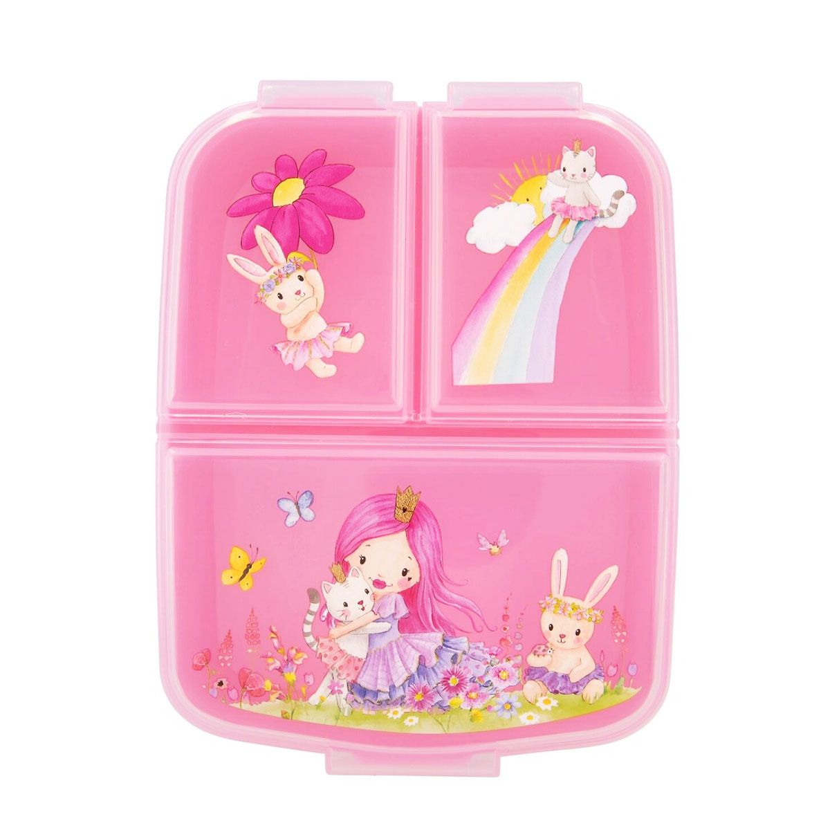 Die rosafarbene Brotdose von Princess Mimi hat drei separate Fächer (1 großes Fach, 2 kleine Fächer) mit praktischen Klipp-Verschlüssen,