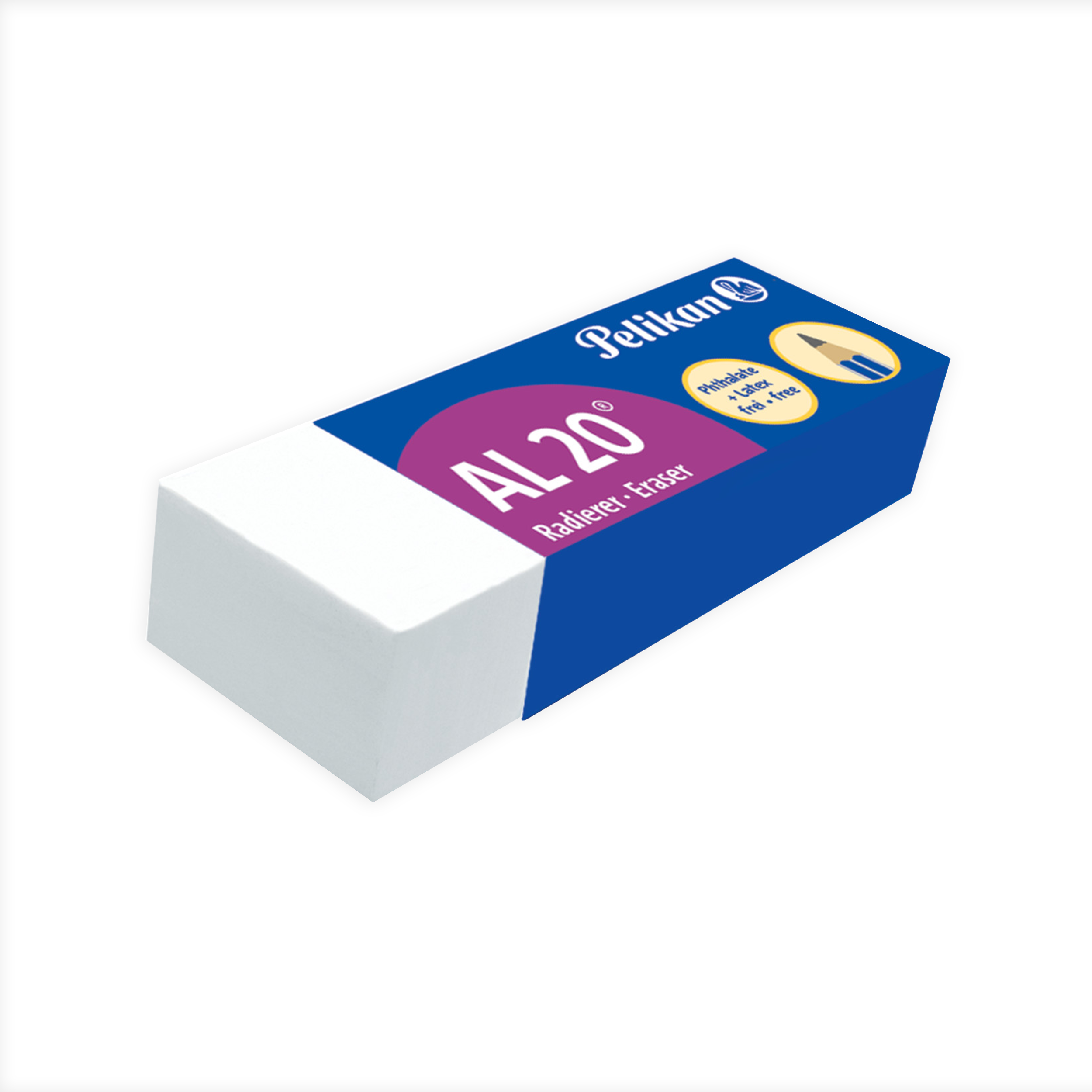 Radierer AL 20®. Werkstoff: Kunststoff. Produktverwendung: für Bleistift, Flächenreinigung. Verwendung für Zeichnungsträger: für alle Untergründe. Material der Schiebemanschette: mit Papier-Banderole. Farbe: weiß. Größe (B x H x L): 65 x 12 x 21 mm. Aus