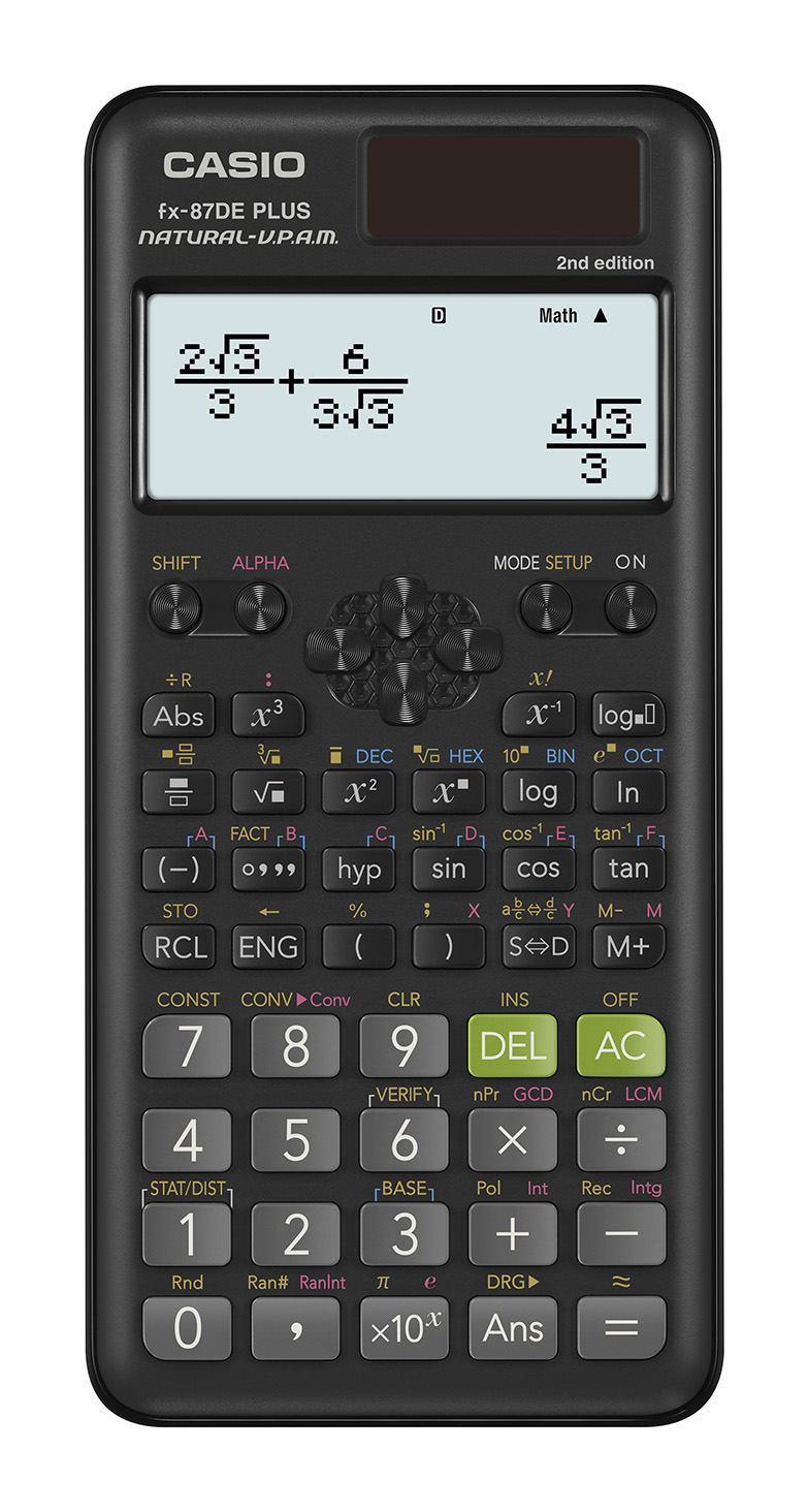 Taschenrechner FX-87DE Plus 2nd edition. Anzahl der Funktionen: 502. Funktionen: Prozent-Rechnung möglich, Deltaprozent-Rechnung möglich, Rundungsautomatik vorhanden, DEG/RAD/GRAD-Umrechnung möglich, statistische Berechnungen möglich, Summenbildung möglich, trigonometrische Funktionen vorhanden. Ausstattung: Schnellkorrekturtaste vorhanden, Vorzeichenwechseltaste vorhanden. Speicher: Wiederholungsfunktion. Anzahl Konstantenspeicher: 40. Anzahl Variablenspeicher: 9. Mit Hardcase, 164 Einheitenumrechnungen, ganzzahligen Zufallszahlen, periodischer Dezimalbruch. Energieversorgung: Two-Way-Power, Solarzelle + Batterie (LR44). Größe (B x H x T): 77 x 11 x 162 mm. Masse: 95 g. Ausführung