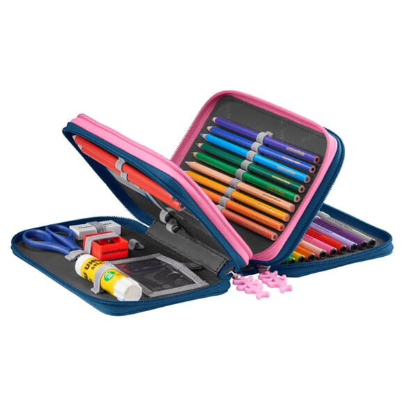 - voll ausgestattetes Federmäppchen mit leuchtendem Motiv auf dem Deckel