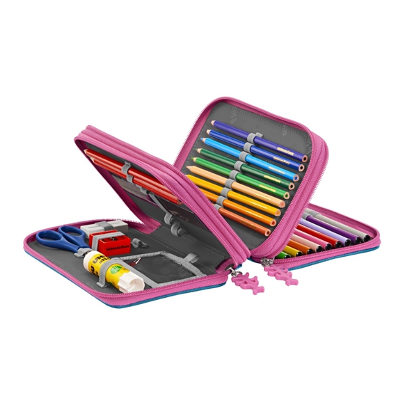 - voll ausgestattetes Federmäppchen mit leuchtendem Motiv auf dem Deckel