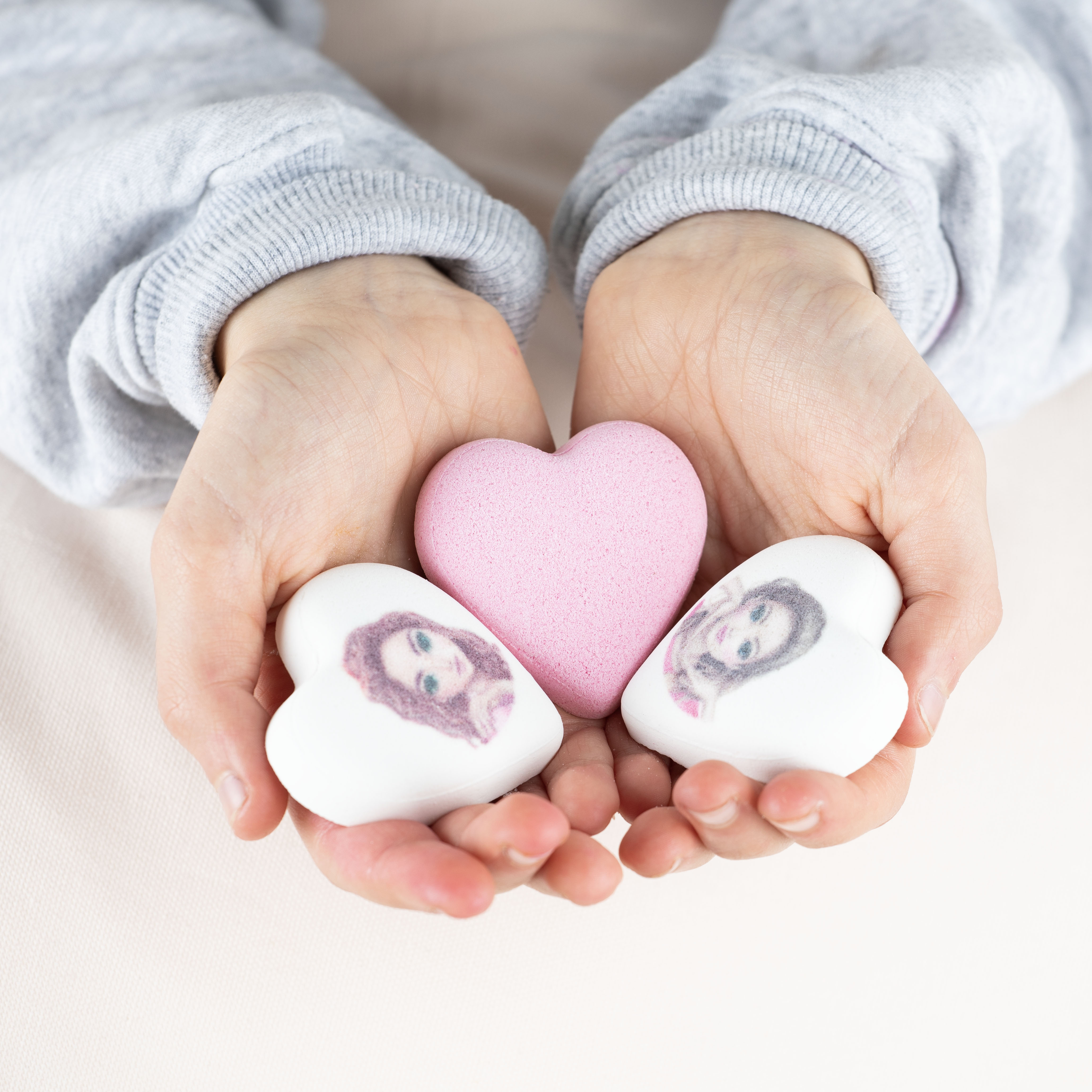 3 Badebomben in Herz-Form (2x weiß mit Model-Motiv, 1x pink).