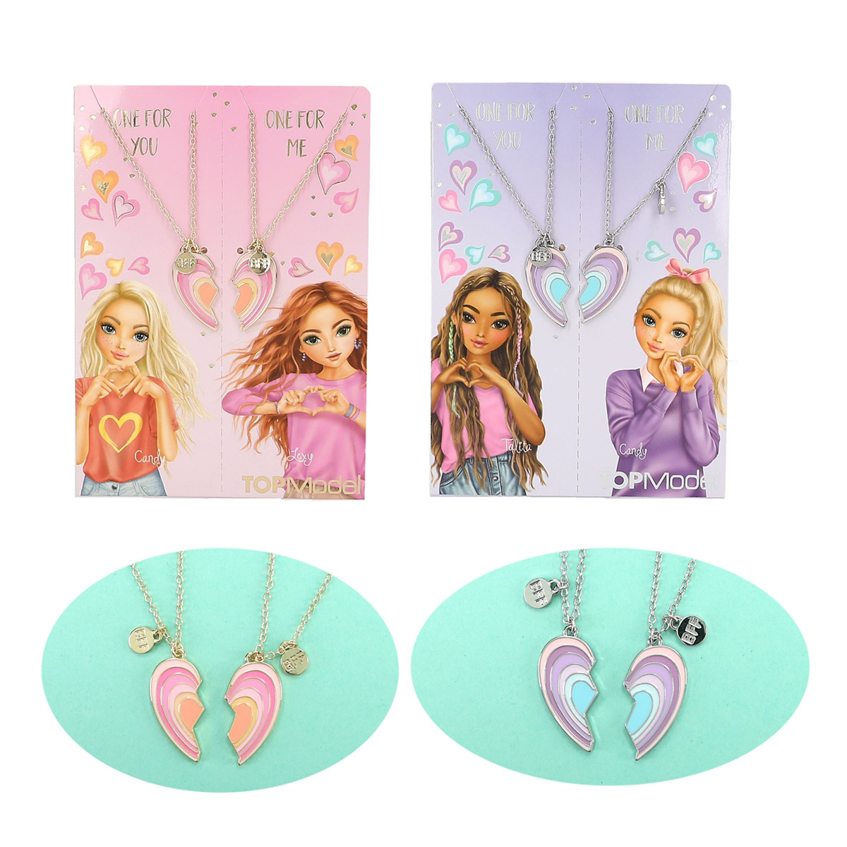 Die BFF-Ketten von TOPModel haben als Anhänger jeweils ein halbes Herz, die perfekt zusammenpassen. 2 Designs: silberne Ketten mit Herz in Flieder und Türkis und goldene Ketten mit Herz in Pink und Orange. Beide mit zusätzlichem kleinem Statement-Anhänger (BFF). Kettenlänge: 40 cm plus 5 cm (verstellbar).