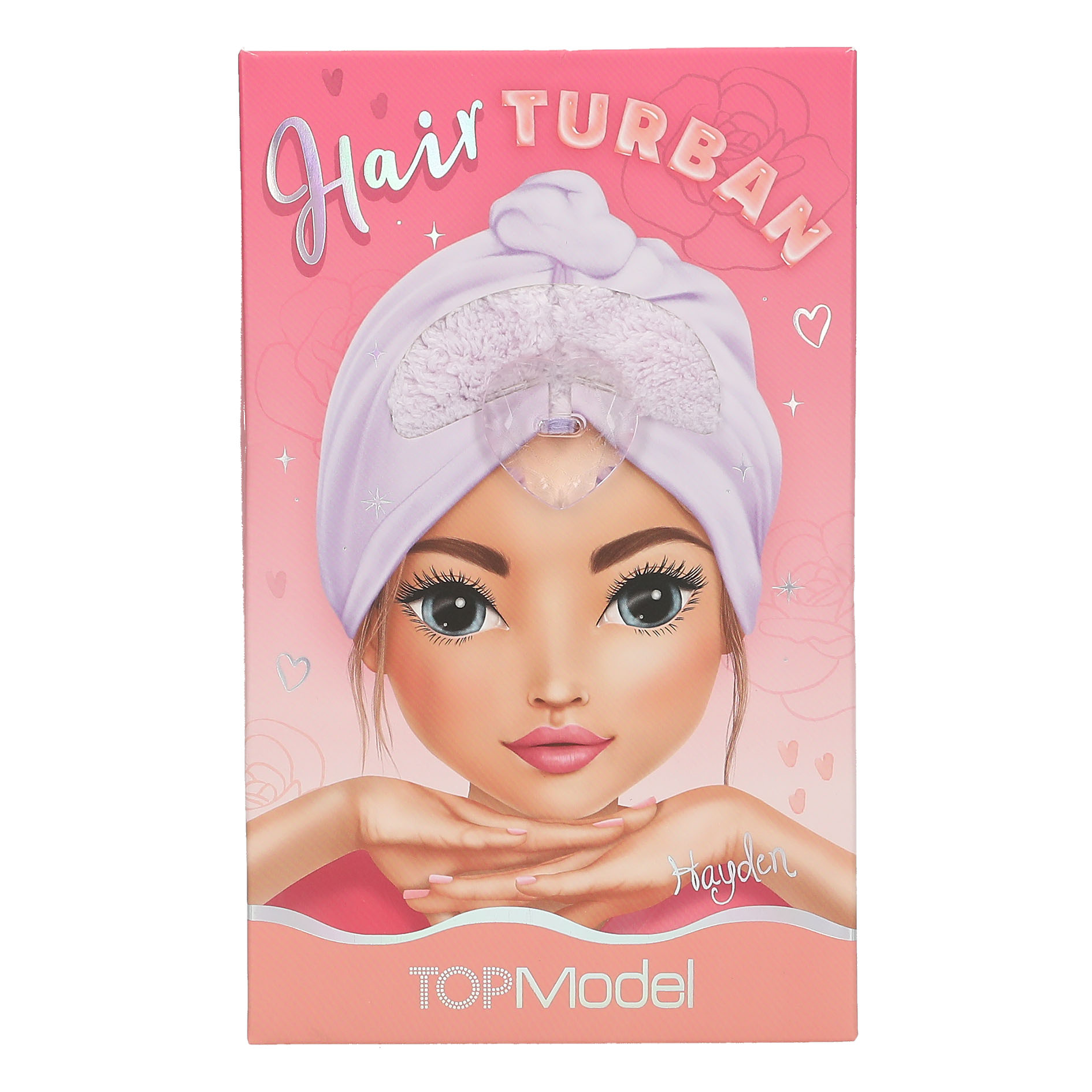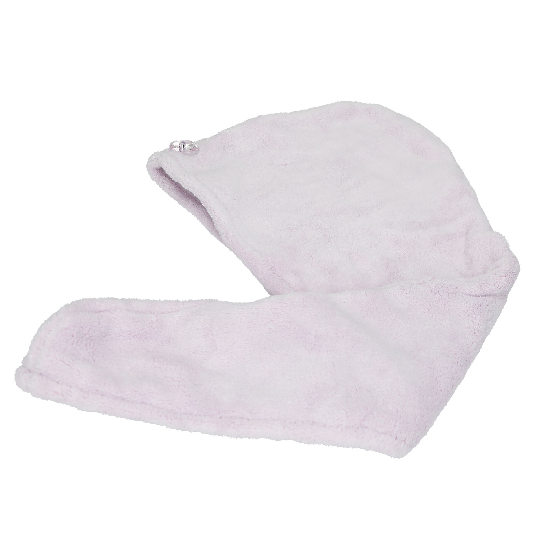 Der Haar-Turban von TOPModel in zartem Lila lässt sich kinderleicht um das nasse Haar wickeln und mit dem weißen, edelsteinartigen Herz-Knopf verschließen.