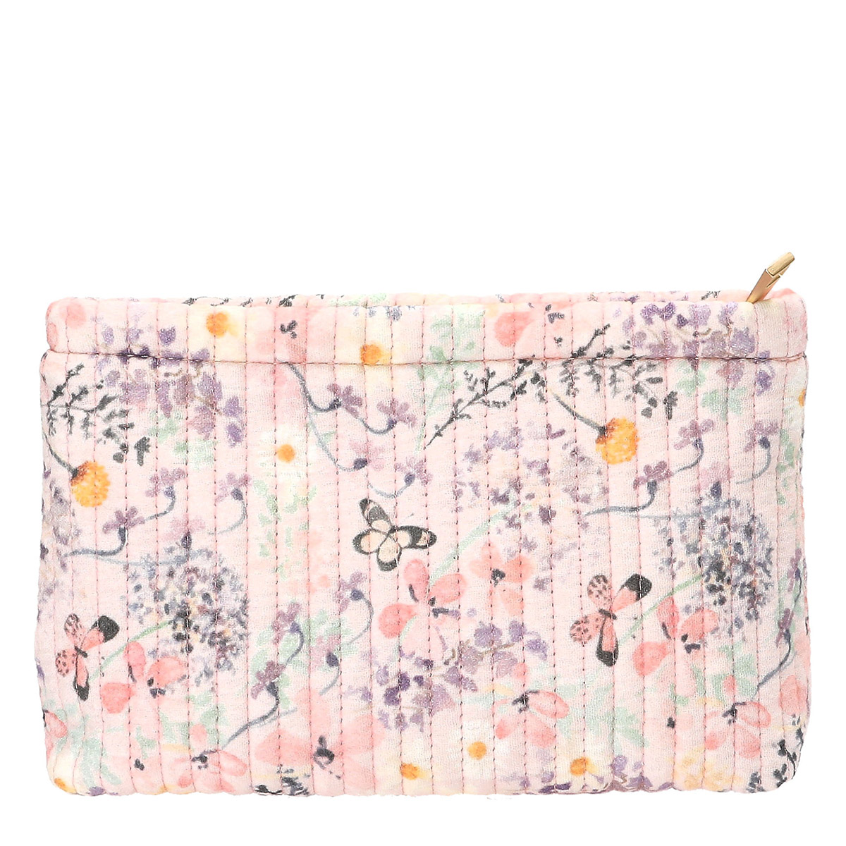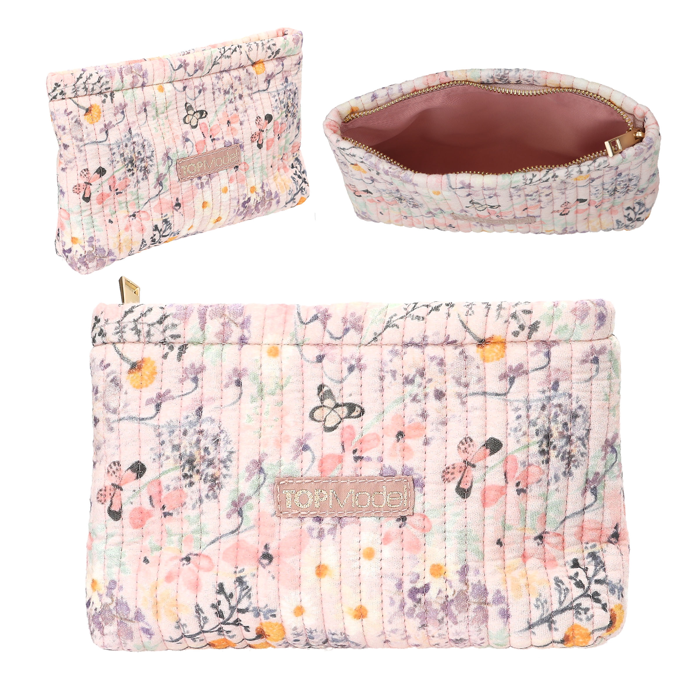 Die kleine TOPModel-Kosmetiktasche hat rundherum ein niedliches Muster aus zarten Blumen und Schmetterlingen auf hellem Grund.