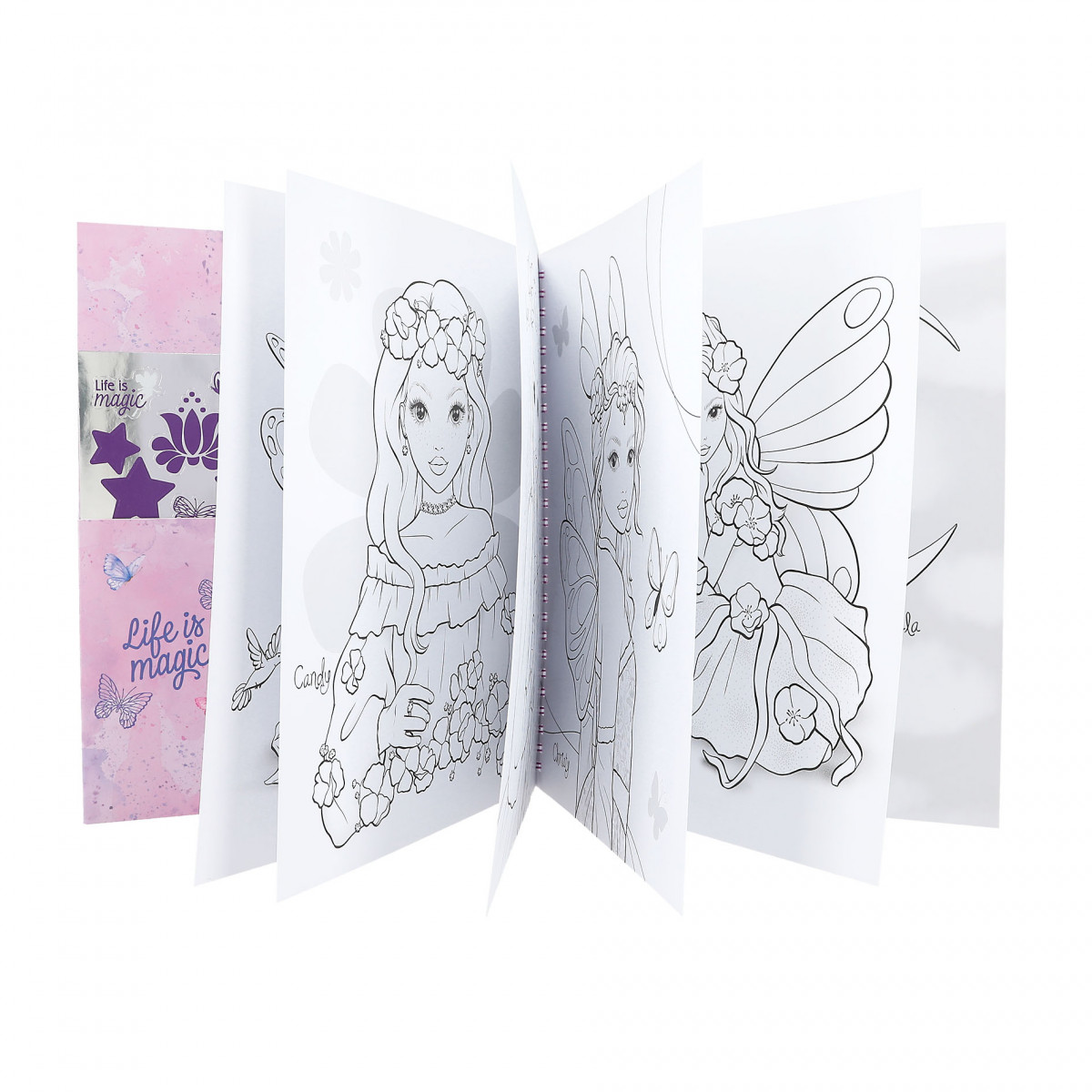 40 verschiedene Ausmalmotive von den TOPModels in der Fantasiewelt mit Feenflügeln, fantastischen Kleidern und märchenhaften Tieren.