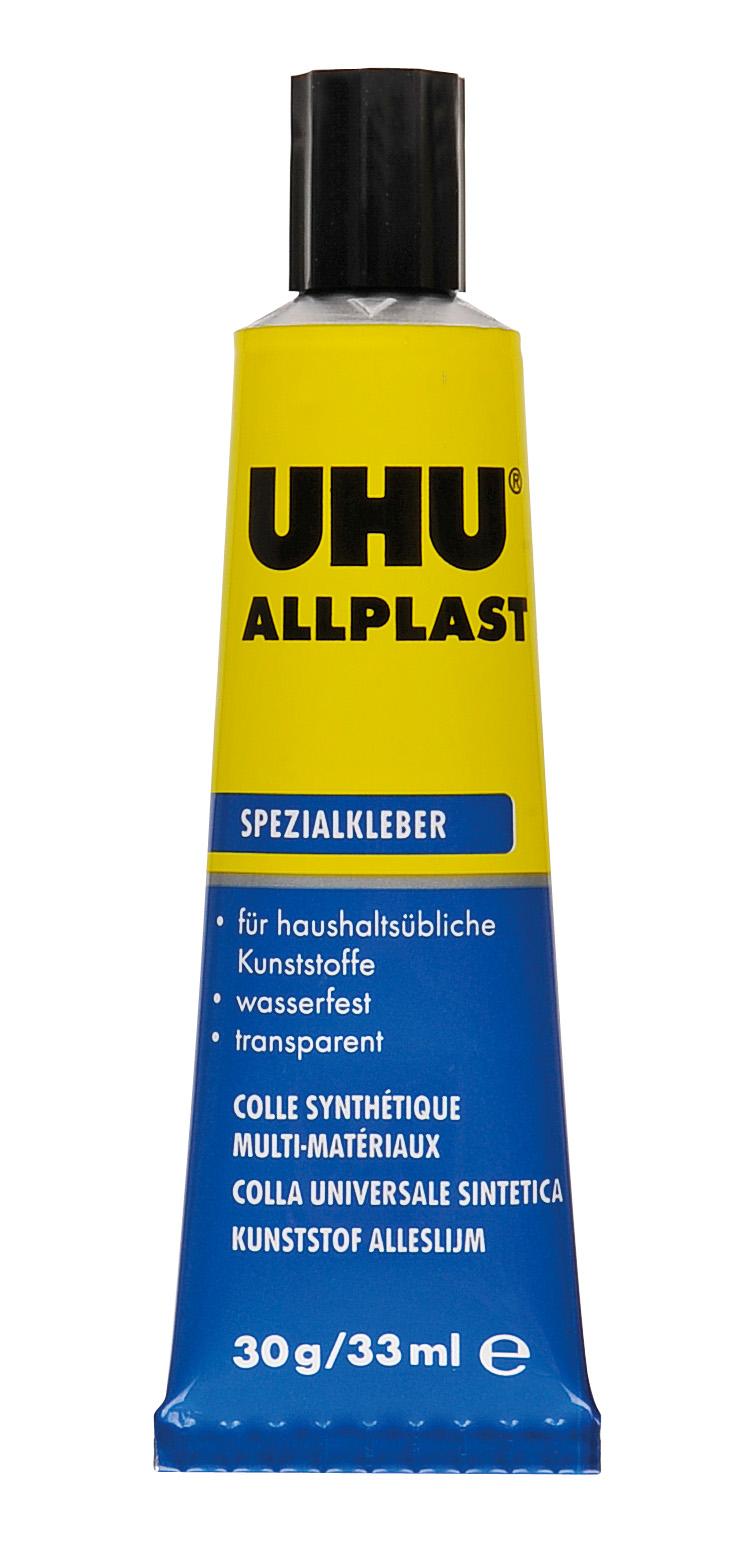 UHU allplast ist ein transparenter, kraftvoller Universalkleber für Kunststoffe zur vielseitigen Anwendung im Haushalt, beim Basteln, Reparieren und im Modellbau. Der harte Klebefilm bleibt transparent und ist kälte- und wärmestabil.