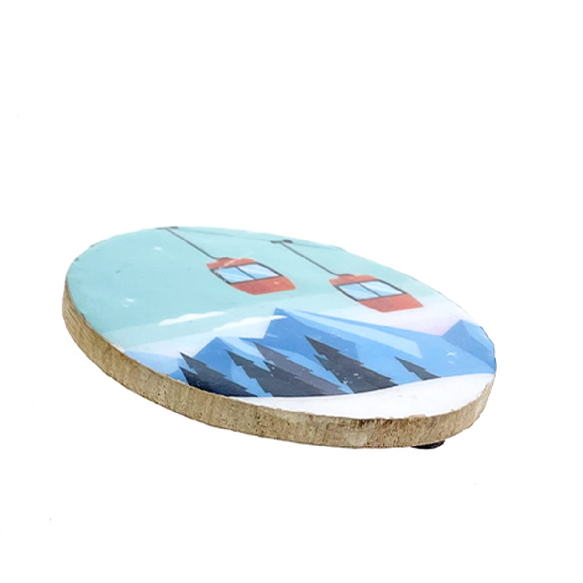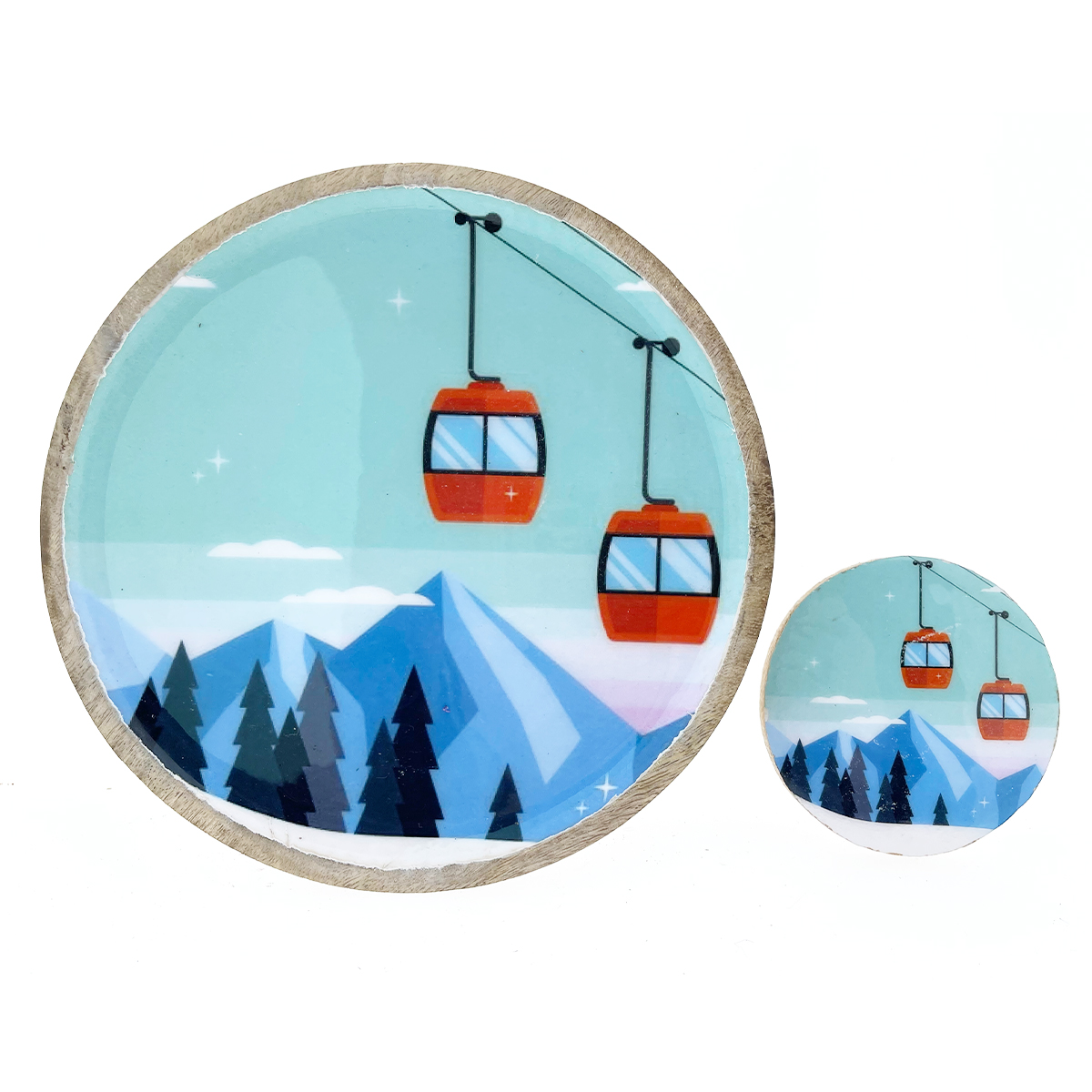 Untersetzer Gondel aus Mangoholz mit Bergmotiv und Seilbahn, Set 4-teilig, Ø10cm