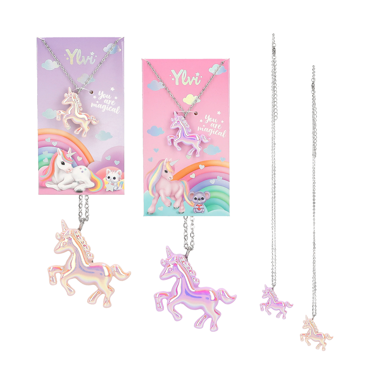 Die silbernen Halsketten von Ylvi haben eine kindgerechte Länge (ca. 40 cm, verlängerbar) und einen schimmernden Einhornanhänger in Pink oder Lila.