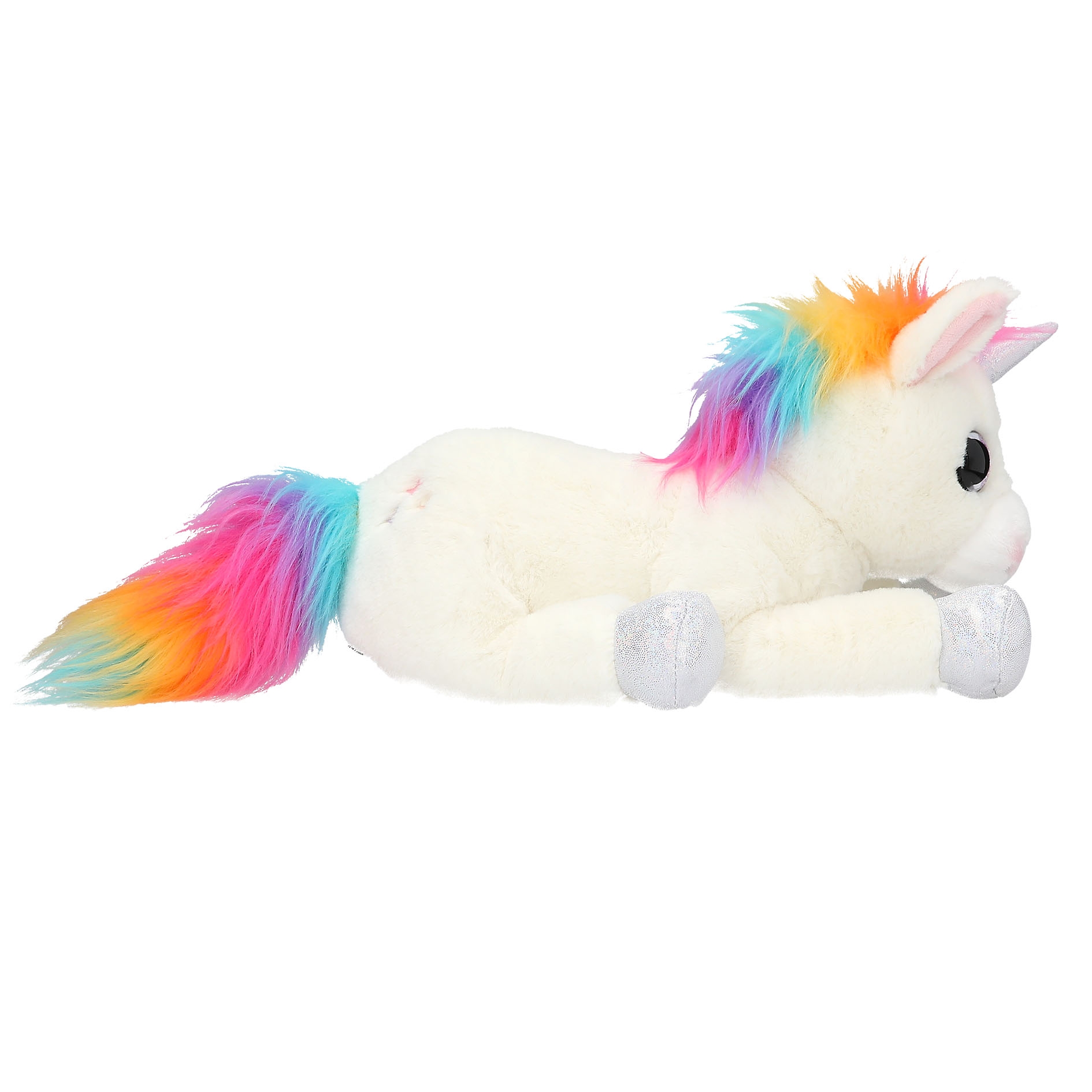 Das liegende Plüsch-Einhorn von Ylvi hat einen superweichen, anschmiegsamen weißen Körper.